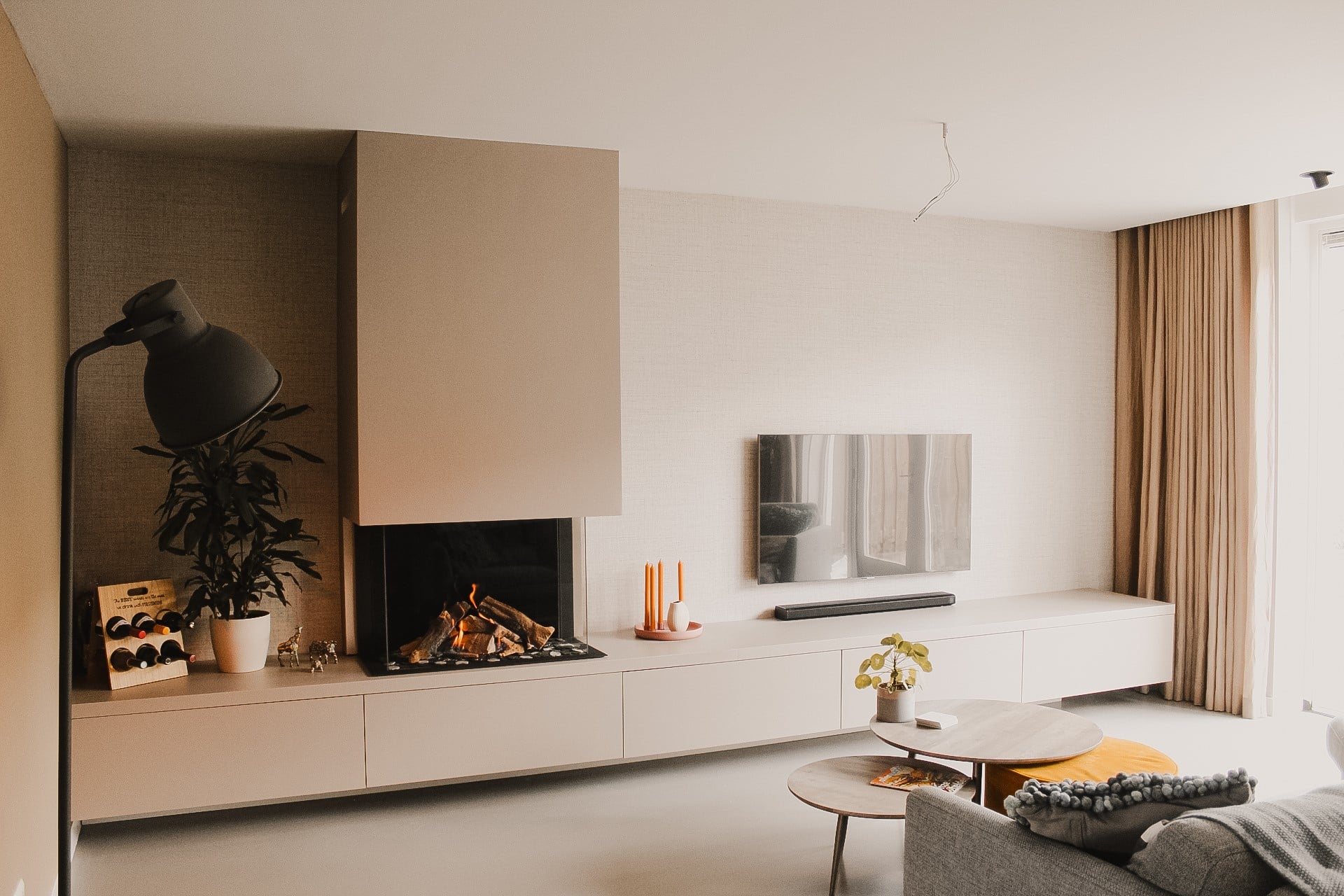 Wat een prachtig haardmeubel! De lichte kleurencombinatie van...