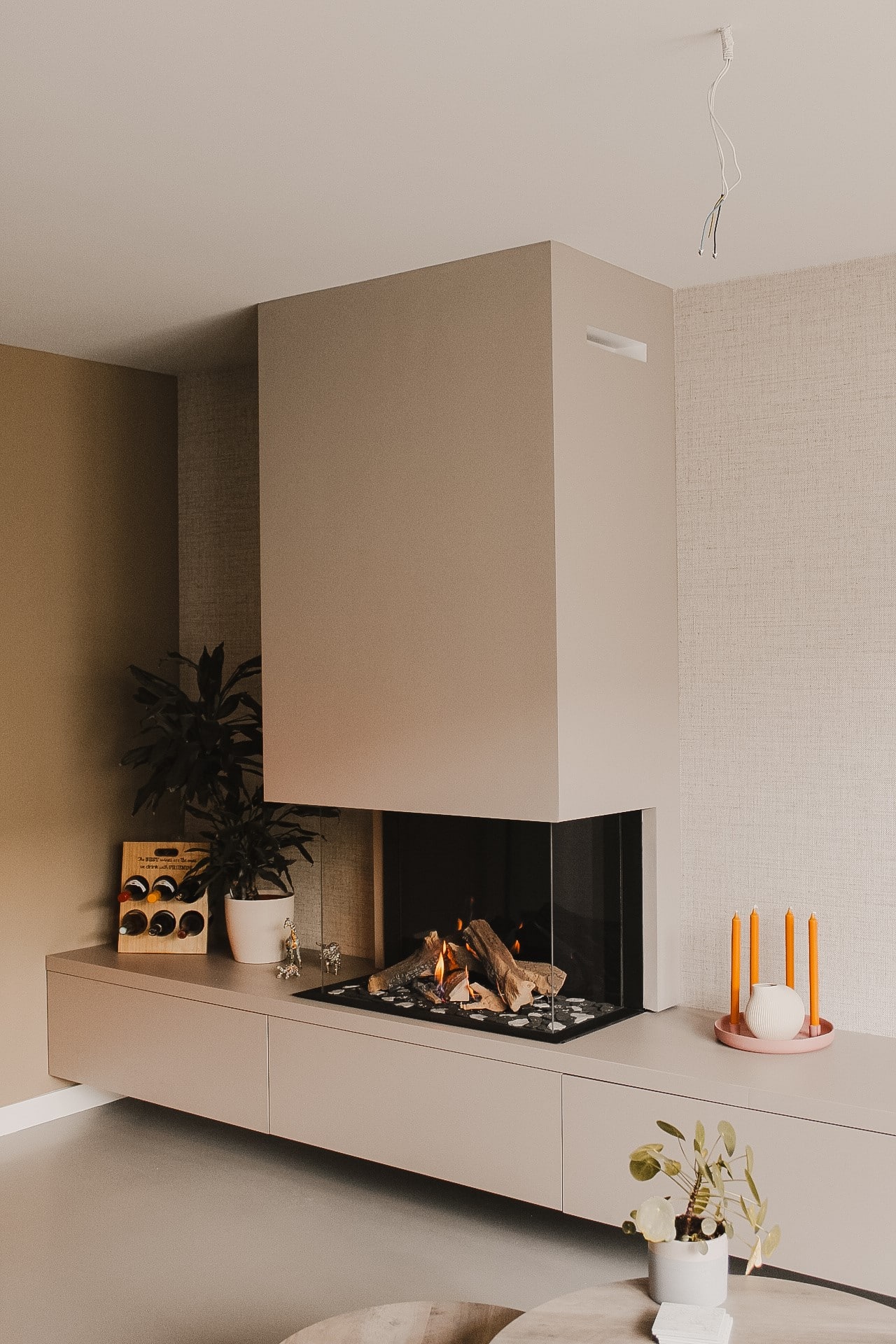 Recent hebben wij deze prachtige driezijdige gashaard opgeleverd inclusief een strak maatwerk meubel.