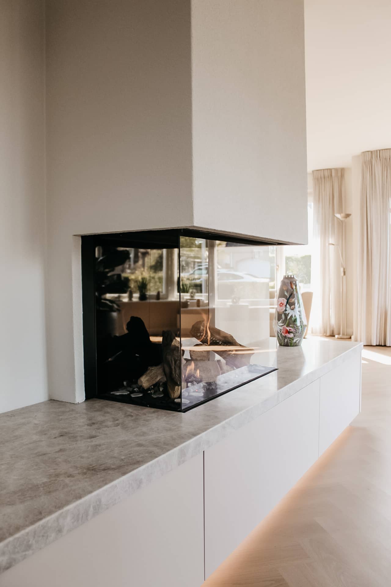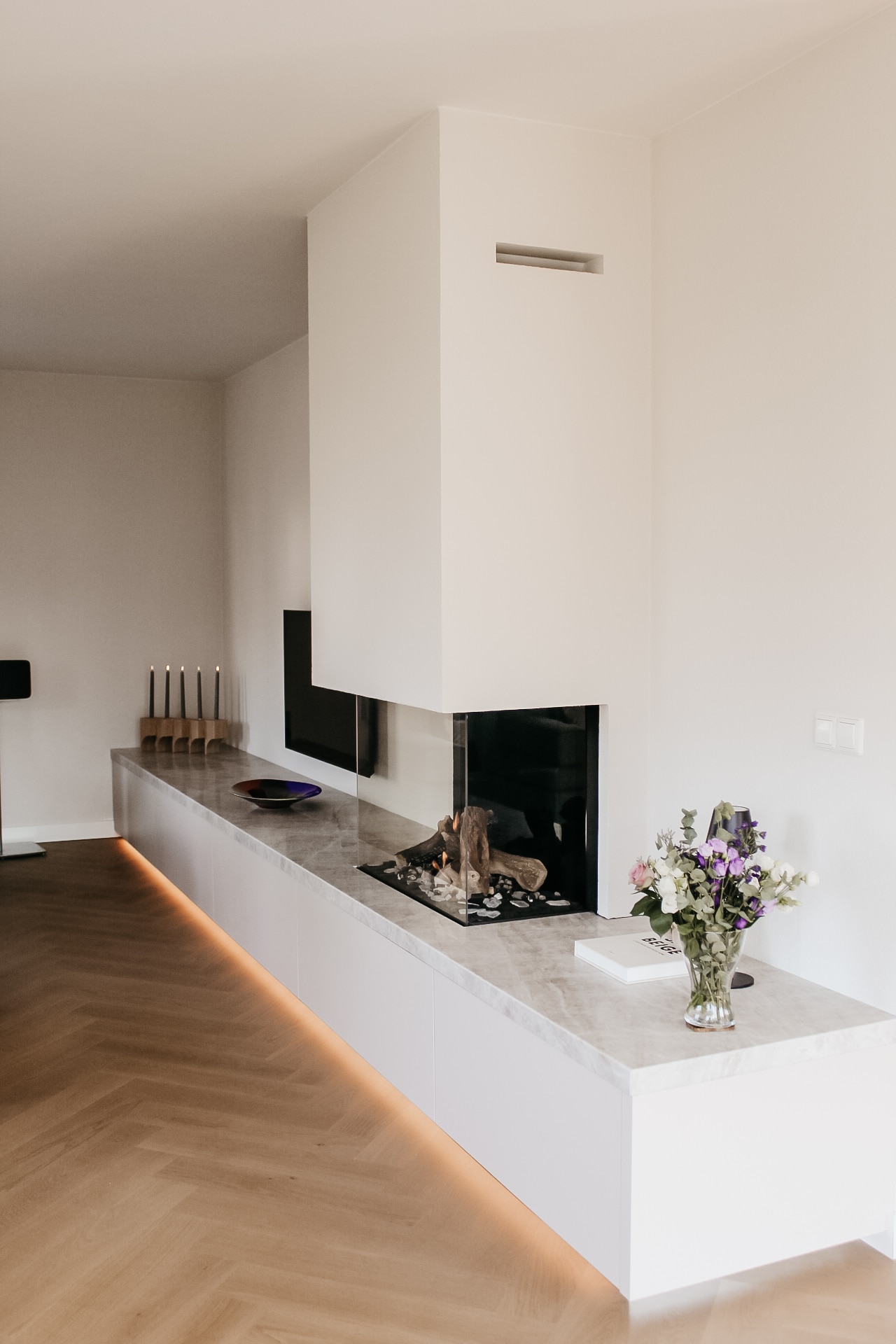 De lichte kleurencombinatie van het haardmeubel is perfect afgestemd met de rest van het interieur.