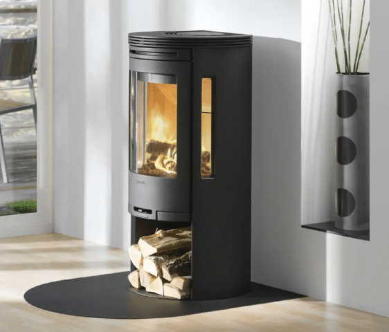 Rechthoekige, licht gebogen stalen vloerplaat 100×80 cm, 2 mm, zwart (RAL 9005). Beschermt de vloer rondom gebogen of ronde kachels. CE-gekeurd, hittebestendig en afgewerkt met een slijtvaste poedercoating.